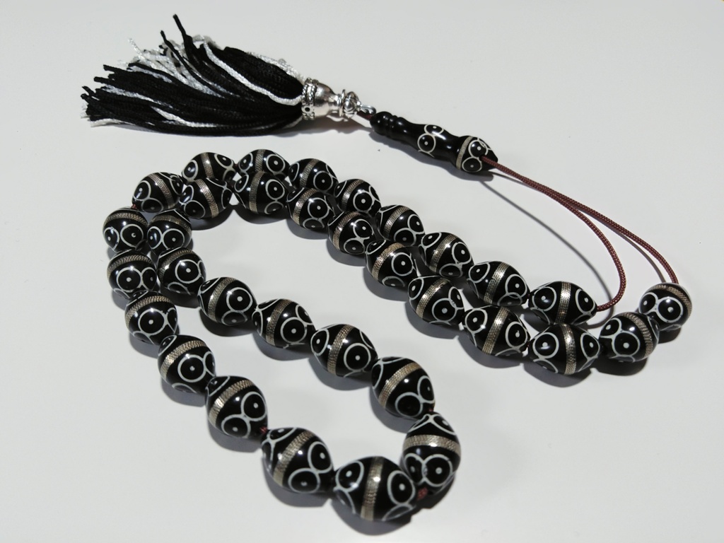 KOMPOLOI COOK WOOD WITH SILVER 33 beads , 33 χαντρες , 46cm , 55gr , 11-15mm
